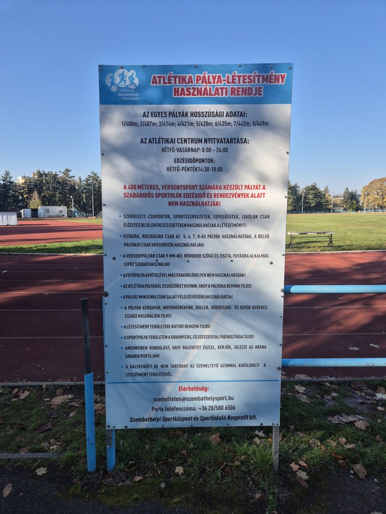 A másik tábla arról tájékoztat, hogyan és mikor lehet használni a Sugár úti pályát. Kevésbé közismert, hogy a létesítmény nyitva áll mindenki előtt; biztosan sokan vannak, akik nem mernek belépni, mert túl komolynak és professzionálisnak tűnik.