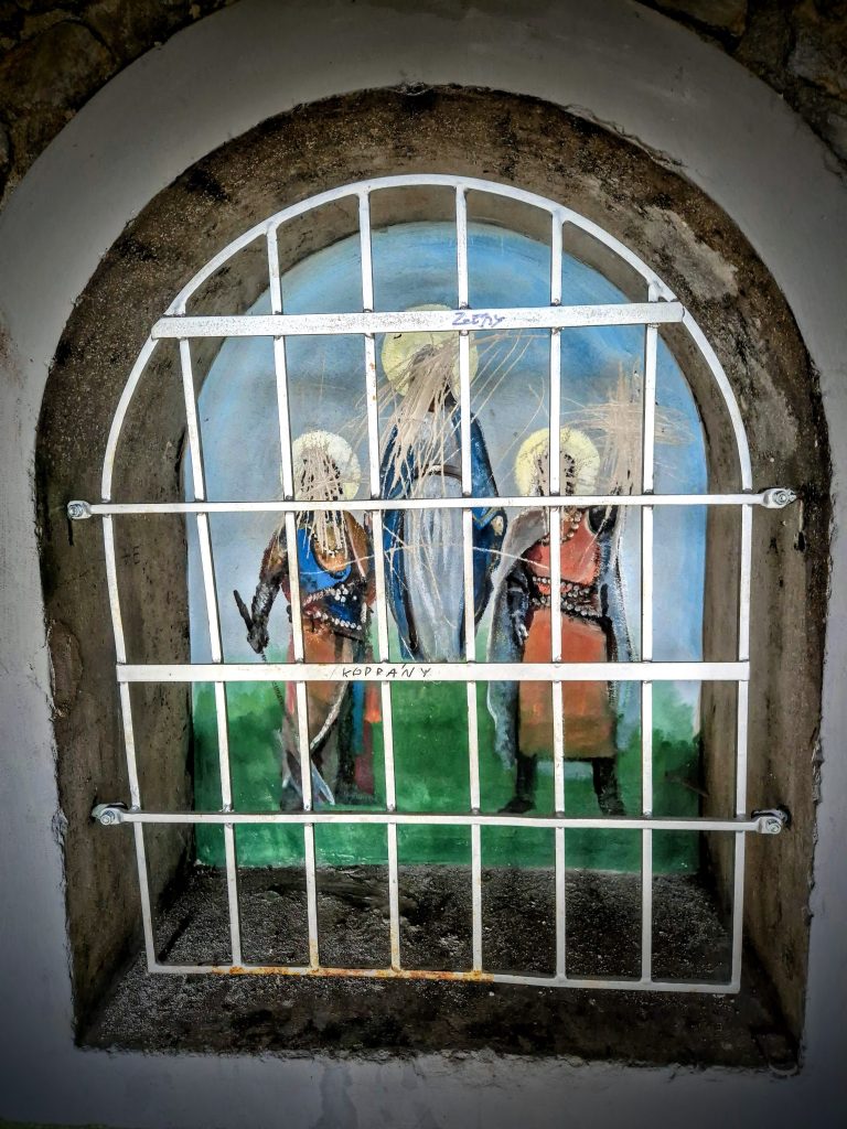 Nem volt könnyű, de azért sikerült. Mármint átnyúlni a rácsok között és fáradságos munkával lekaparni a szentek arcát. Mind a háromét. Kellett hozzá idő, kitartás és szerszám (talán egy fémpénz). De végül csak sikerült megoldani, sőt még az egyik szent kezében levő kereszt eltávolítására is jutott energia, kitartás.